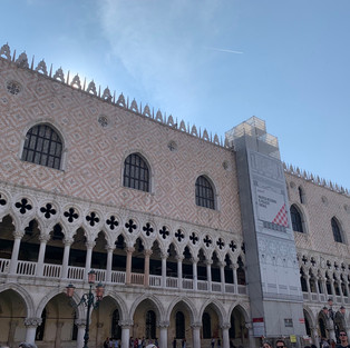 When you look at the basilica there is so much history just on the outside. Not only does it have the Tetrarch, it also contains at the top the replicas of the four horse statues that were taken from the Hippodrome in Constantinople. The originals are within the upper part of the basilica and they are exquisite to see up close. As you move to the front of the basilica you start to see these amazing mosaics on the inside of the arches to the doorways that lead inside the church. It is full of such rich, vibrant colors. The only negative that I would say about the basilica is that you cannot take pictures once you are inside. On the one hand I get it, there are so many people and you want to protect the art but it is such a good example of Romanesque architecture. After beginning herded through the lower level, we went up to the balcony, this cost extra but was included in our tour. This is where the original four horse statues are located. You also can go out to the terrace and from there you get amazing views of the clock tower and the main canal of Venice. Also included with our tour was entrance to a museum opposite of the basilica. I went in and it was very nice. Unfortunately Ken didn't go in because he sprained his ankle on the terrace at the basilica and needed to rest. My husband was such a trooper on this trip. If this happened to me, I'm not sure I could have done all we did and not complain. He was amazing!!